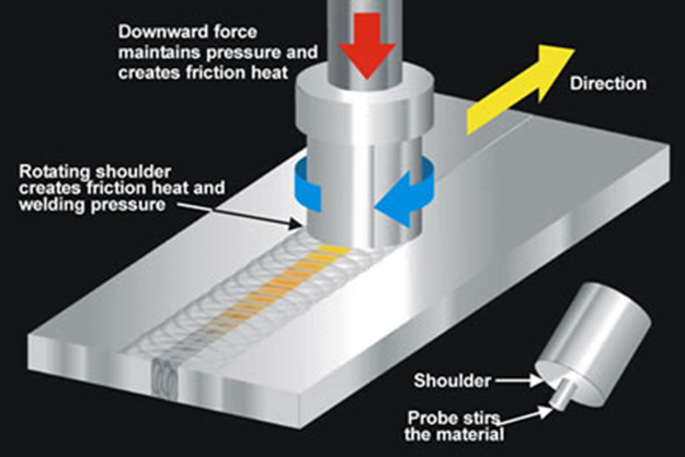 الصورة توضّح مبدأ اللحام بالاحتكاك الدوّار (Friction Stir Welding - FSW)، وهو تطبيق فيزيائي يعتمد على الاحتكاك لتوليد حرارة كافية لتليين المعادن دون صهرها. أداة معدنية دوّارة تُضغط بقوة على السطح المشترك بين قطعتين معدنيتين، فتولّد الحرارة من الاحتكاك والدوران هذه الحرارة تُحدث حالة لدنة في المادة، فيندمج المعدن من الجانبين مشكلاً وصلة متماسكة العملية تتم بضغط ميكانيكي مستمر يضمن قوة التحام عالية. فيزيائيًا تتحول الطاقة الميكانيكية إلى حرارية ثم إلى طاقة داخلية تُعيد ترتيب البنية البلورية للمعدن