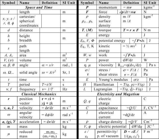 هنا تجميع لرموز لكميات فيزيائية أساسية تستخدم لوصف وتفسير الظواهر الطبيعية حولنا، وذلك في كل الفروع من الميكانيكا وkinematics إلى الكهرومغناطيسية.