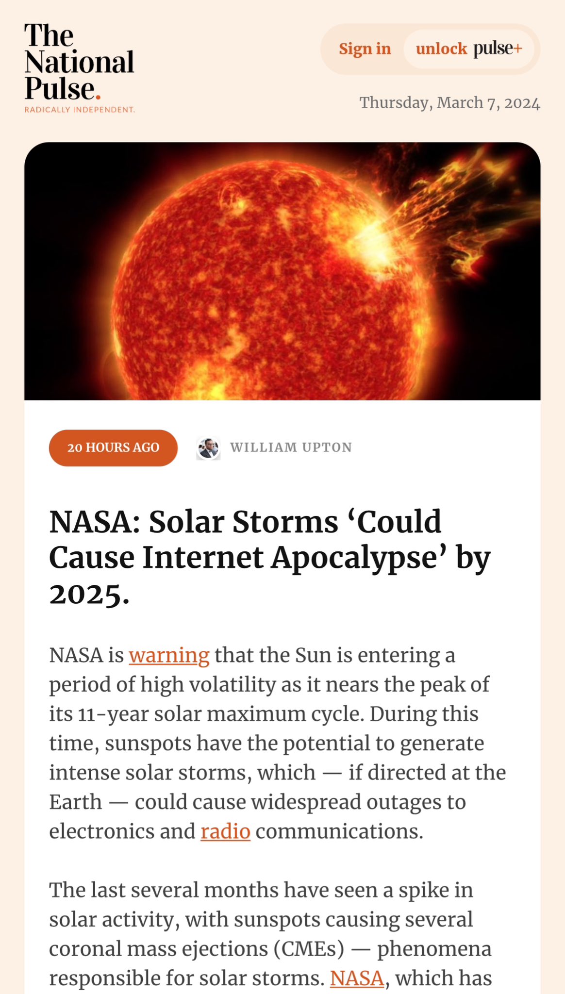 ناسا تستعد لما أطلقت عليه (يوم قيامة الإنترنت) أو (الانهيار الكبير للإنترنت) الذي يتوقعون حدوثه بحلول 2025 بسبب عاصفة شمسية عنيفة ستضرب الأرض السنة القادمة.