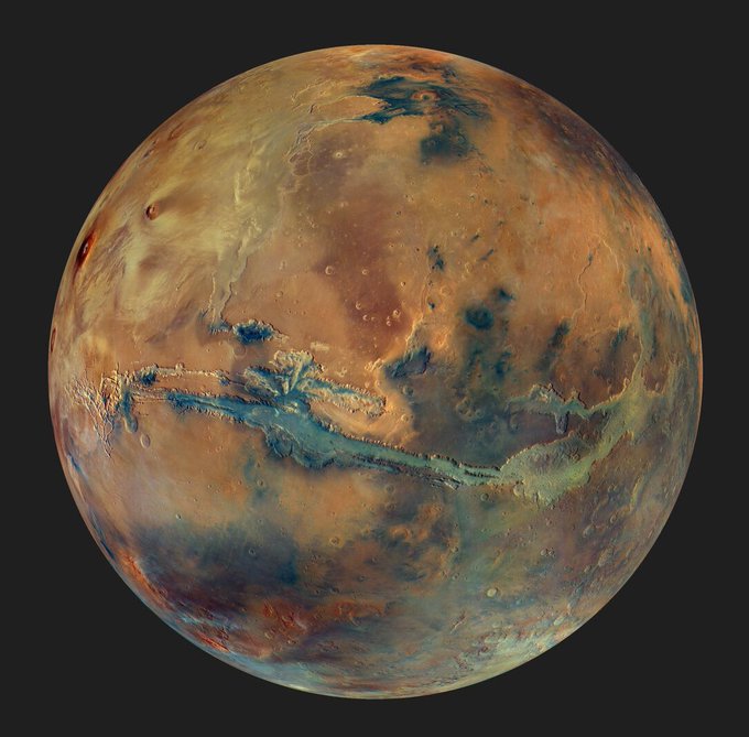 صورة جديدة مذهلة للمريخ. وكالة الفضاء الأوربية تصور المريخ بكاميرا عالية الوضوح. لم تكن صورة واحدة إنما فسيفساء من 90 صورة، كل منها لمساحة حوالي 2500 كم مربع. كل لون فيها يعبر عن مواد مختلفة، أنت الآن ترى المريخ كما لم يره أحد من قبل.