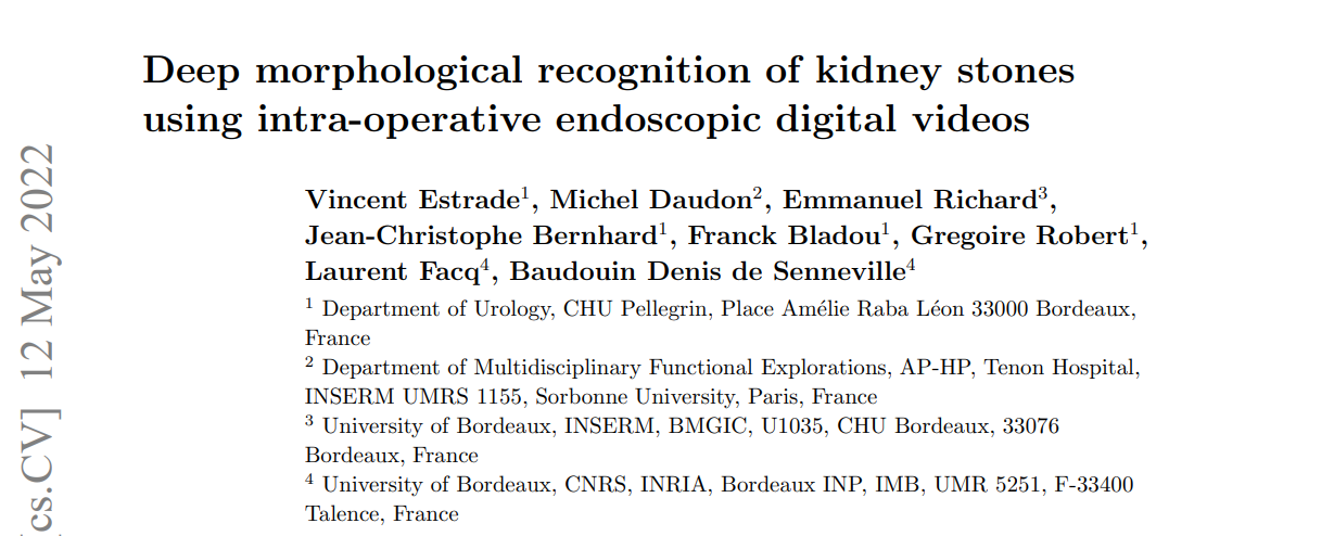 في دراسة نُشرت عام 2022، طوّر باحثون نموذج ذكاء اصطناعي لتحليل مقاطع الفيديو التنظيرية أثناء جراحة حصى الكلى بهدف تحديد نوع الحصى مباشرة دون الحاجة لتحاليل مختبرية. استُخدمت بيانات من 71 مقطع فيديو و585 صورة لتدريب النموذج على تمييز ثلاثة أنواع: أوكسالات الكالسيوم (COM وCOD) وحمض اليوريك (UA). بلغت دقة النموذج 88%، مما يبرز قدرته على دعم قرارات الأطباء أثناء الجراحة ( arXiv:2205.06093).