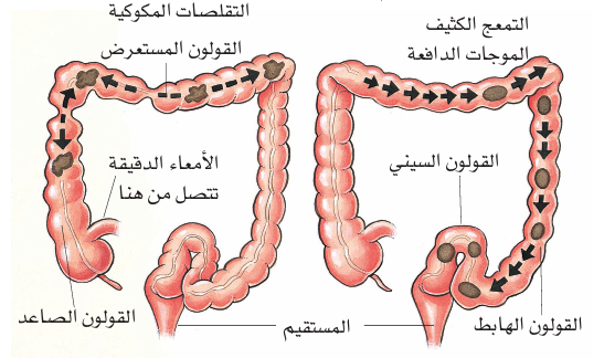 عندما تتقلص العضلات الموجودة في جدار القولون فإنها تدفع بمحتوياته الى الامام . وعندما تتقلص اجزاء صغيرة ثم تسترخي فحينئذ تتحرك المحتويات الى الامام والخلف. فاذا تتالت التقلصات على شكل موجة على امتداد القولون عندها تتحرك المحتويات نحو المستقيم . ولا يمكن الاختلاف في قوة التقلصات بل في استمرار هذه التقلصات في التحرك باتجاه واحد نحو المستقيم .