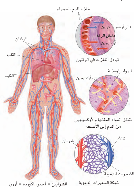 رسم بياني للقلب والدورة الدموية، والأوردة ( ذات اللون الأزرق) وهي تُرجع الدم إلى القلب؛ حيث يتم ضخه إلى الرئتين، ثم يُضخ مرة أخرى إلى الجسم عبر الشرايين ( ذات اللون الأحمر) . تتفرع الأوعية الدموية الكبيرة إلى أخرى أصغر وأصغر، ثم إلى شبكات صغيرة من الأوعية الدموية تعرف بالشعيرات الدموية، حيث يُنقل الأوكسيجين والمواد المغذية من الدم إلى الخلايا المحيطة.