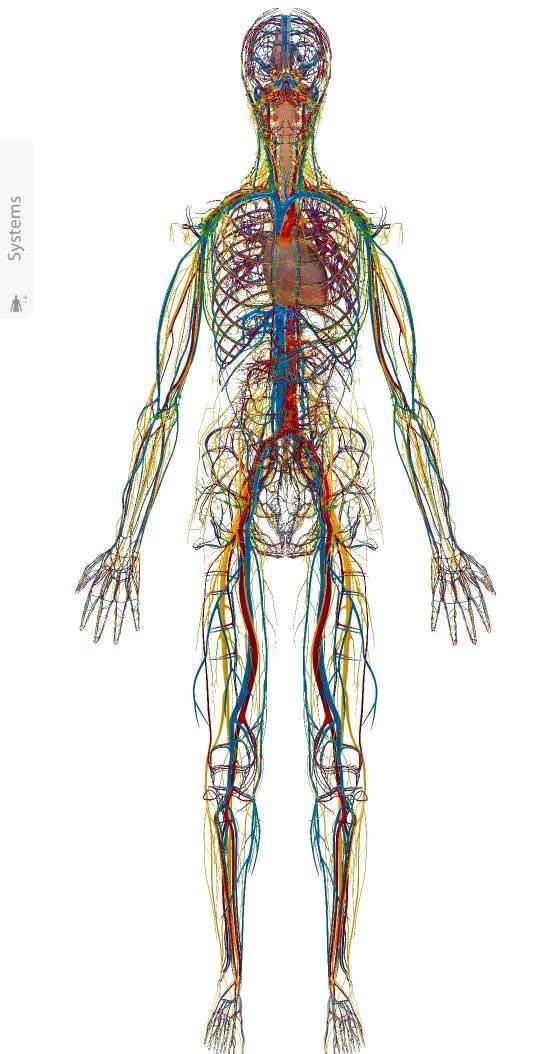 اذا تم نزع جلد الانسان والعظام والعضلات والامعاء ، يمكن مشاهدة شبكة من الأوعية الدموية تتكون من الشرايين الحمراء والاوردة الزرقاء والاعصاب الصفراء والأوعية اللمفية الخضراء..والتي يقدر طولها معا باكبر من طول قطر الكرة الارضية ب 5 مرات..