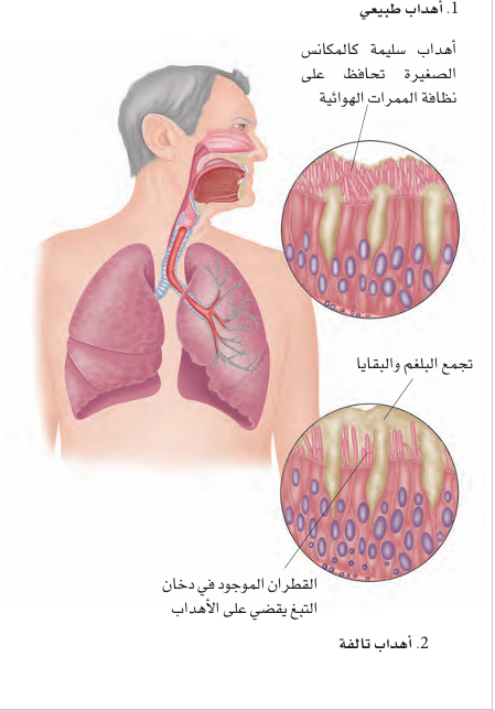توجد نتوءات تشبه الشعر على طول الممرات الهوائية تسمى الأهداب ، تتمثل وظيفتها بإزالة الميكروبات والبقايا من داخل الرئتين .