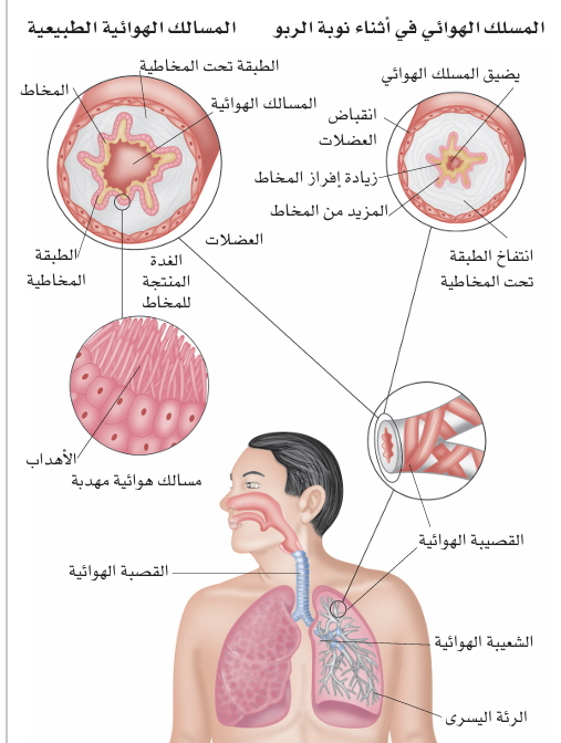 في اثناء نوبة الربو , تنقبض الجدران العضلية للمسالك الهوائية . ما يتسبب في تضييق القطر الداخلي للمسالك الهوائية . وتتسبب زيادة الافرازات المخاطية وزيادة التهاب البطانة الداخلية للمسالك الهوائية في حدوث المزيد من التضييق .
