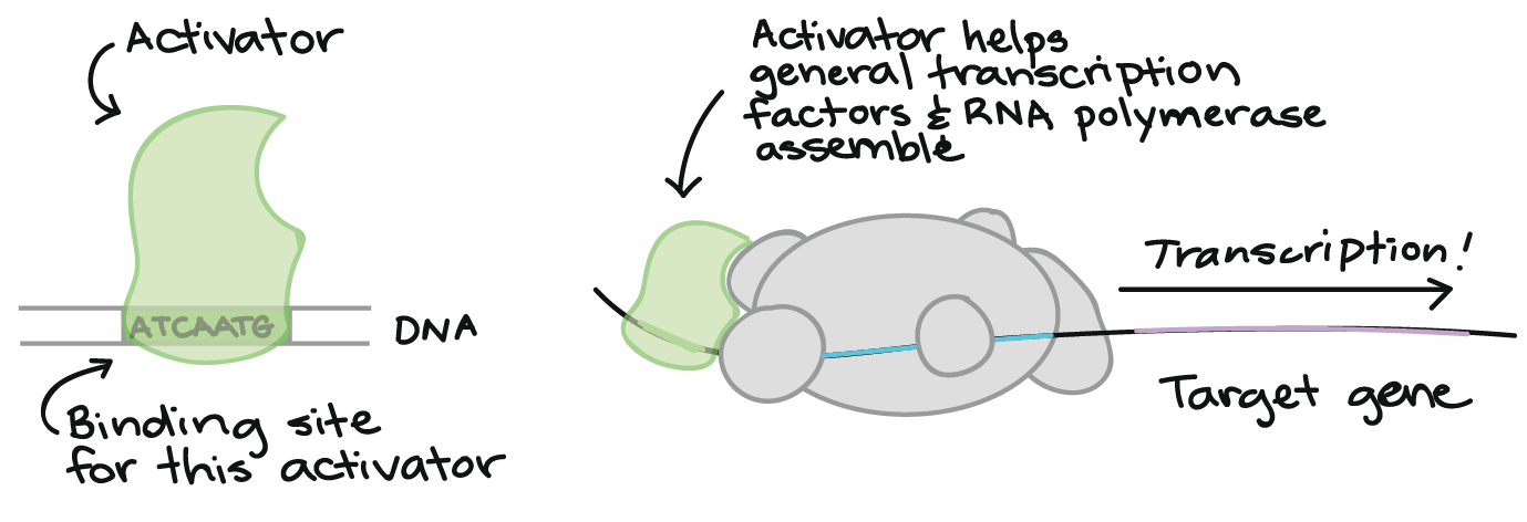 لتنشيط أي جين لا بد من وجود عددا من البروتينيات تعرف بعوامل النسخ Transcriptions factors التي ترتبط بجزئ من الجين يدعى المنشط او المعزز Promoter ليتمكن باقي الجين من التعبير عن نفسه في بدء عمل نسخ الحامض النووي الرسول mRNA المسئولة عن انتاج الانزيم والذي يقوم بإتمام التفاعل الحيوي واظهار الصفة المحددة وعليه فان عامل النسخ هذا هو بمثابة مفتاح التشغيل للجين On-gene.