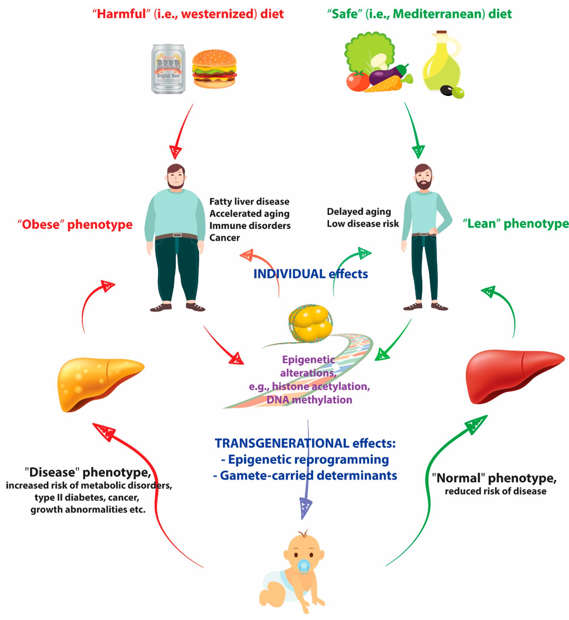 دراسة تأثير الأغذية في أحداث الوراثة اللاجينية والتي لا تخص التركيب الوراثي وانما ما يتعلق بعمليات التعبيرعن المعلومات الوراثية مثل عمليات مثيلة DNA وتحولات الكروماتين التي تؤثر في ناتج التفاعلات على النمط المظهري الذي يتصف به الشخص كما يظهر في التوائم المتماثلة وكذلك التباين المتفاوت بين سكان نصف الكرة الشمالي والجنوبي والمناطق المختلفة من العالم نتيجة اختلاف العادات الغذائية .