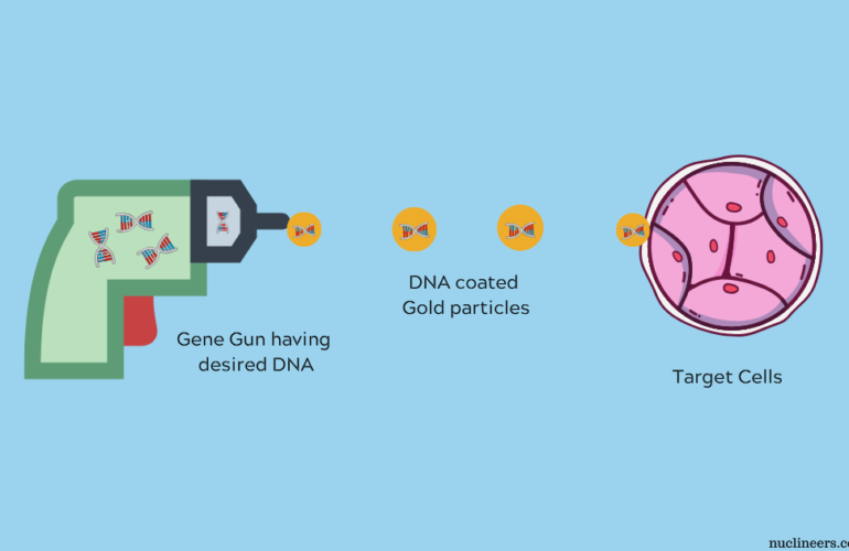 وهي طريقة لقذف الخلايا النباتية بالمادة الوراثية المنقولة بعد تغليفها لجسيمات معدنية فلزية ذات اقطار 1-2 ميكرون مثل كريات الذهب . يتم قذف تلك الجسيمات بسرعة عالية باستخدام المسدس الجيني لتخترق طلاقاته جدار الخلايا وتنقل الجين المرغوب .