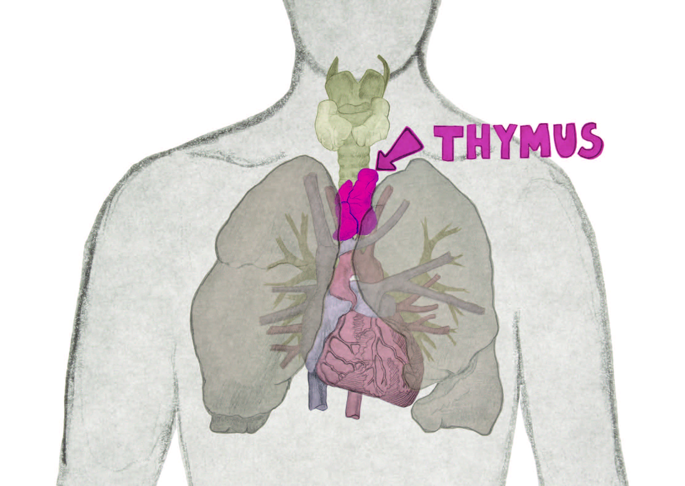 الثايمس Thumus : تقع غدة الثايمس قريباً من الغدة الدرقية ما بين القفص الصدري والقوس الأورطي في الجزء العلوي من المنطقة الصدرية. يبلغ حجم الغدة أكبر ما يمكن خلال المرحلة الجنينية ثم يبتدئ في التناقص بعد 14 سنة من العمر ثم تضمر مع تقدم العمر. تفرز الثايمس هرمون الثايموبايوتين (Thumopoietin) وهرمون الثايموسين Thymosin المسؤولان عن تنشيط الخلايا المناعية T .