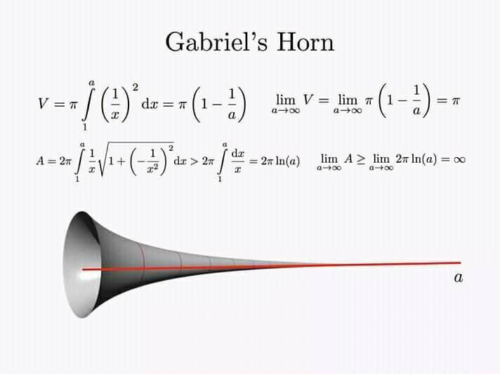 شكل هندسي له حجم منتهي ومساحة سطح غير منتهية!???? تسمى ايضا مفارقة الطلاء حيث تكون كمية الطلاء اللازمة لطلاء سطح هذا الشكل لا نهائية مع ان حجمه محدود !!