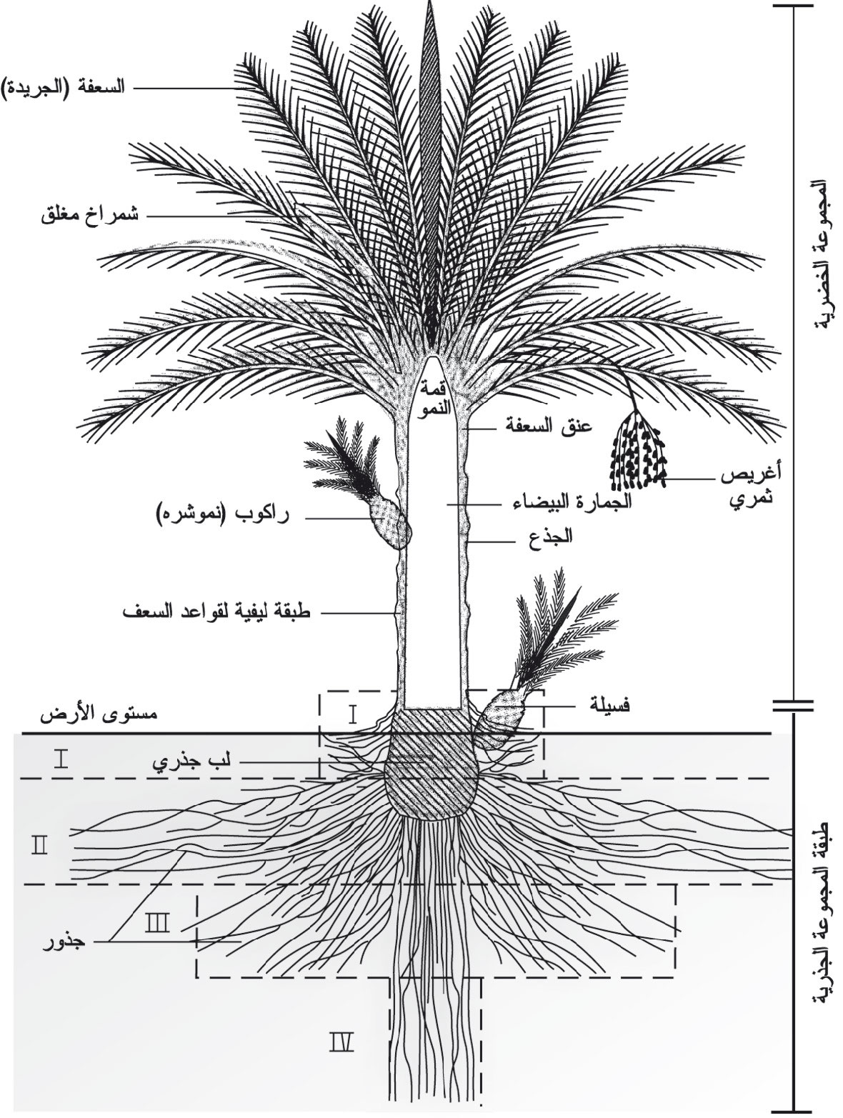جذور النخلة قادرة على التنفس في الماء بعكس جذور النباتات الارضية الاخرى وتنتشر جذور النخيل في مساحة تقارب 160 متر مربع في الترب الخفيفة ويصل الجذر الممتد من قاعدة النخلة الى عمق يتجاوز 10،5 م .