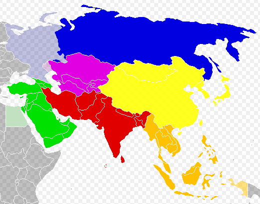 أجزاء القارة الاسيوية وألوانها المبينة على الخريطة: