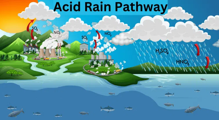 آثار الأمطار الحمضية على التربة والنباتات : يكون التأثير غير المباشر للمطر الحمضي على النباتات بسبب التغيير في كيمياء التربة، إذ تتغذّى النباتات على المواد العضوية التي تحلّلها الكائنات الدقيقة الموجودة في التربة وتحوّلها إلى غذاء، ويؤثّر المطر الحمضي على هذه الكائنات، إذ يُسبّب نقصان في أعدادها، فهو يزيد من حموضة التربة، فينتج عن ذلك تقليل تركيز مغذّيات النباتات، وموت بعض النباتات أحياناً، أو إبطاء سرعة نموّها، إلى جانب تقليل قدرتها على تحمّل الظروف البيئية الصعبة مثل الرياح القوية والبرودة.