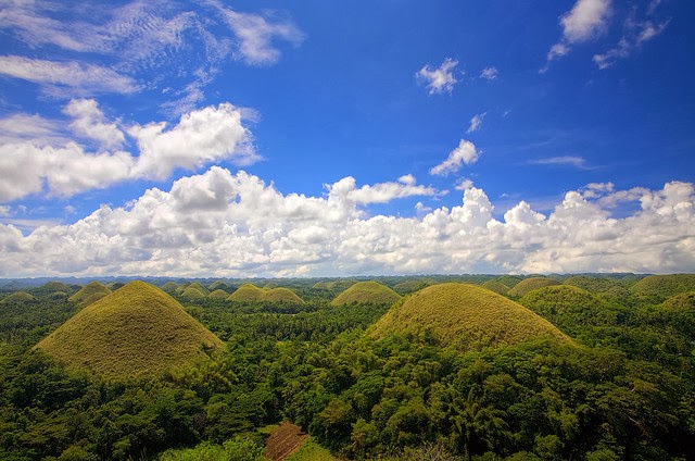 تلال الشوكولاتة :هي التكوينات الجيولوجية الغيرعادية التي تتكون من 1,268 على الأقل من التلال المخروطية المنتشرة في جميع أنحاء المناطق الداخلية من جزيرة بوهول في الفلبين والتشكيلات تقريبا متناظرة وبنفس الحجم بارتفاع 5000 متر (98-164 قدم) وتغطيها الأعشاب الخضراء وخلال موسم الجفاف العشب يتحول لونه ومن هنا جاءت تسميته ولم يصل الجيولوجيين لأي توافق في الآراء حول كيف تكونت هذه التلال العملاقة لكن أحد النظريات تقول أن تلال الشوكولاتة هي تكوينات صخرية من نوع الحجر الجيري البحرية على رأس كل طبقة من الطين.