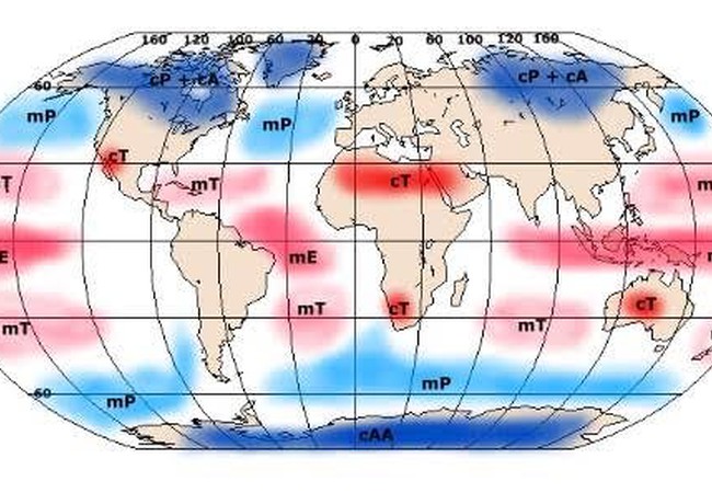 الكتل الهوائية: تعرف بانها جسم ضخم من الهواء متجانس في خصائصه الطبيعية الحرارة والرطوبة والاستقرار, ويبلغ قطرها مئات أو ألاف الكيلومترات، ويقل تجانس خصائص الكتل الهوائية بالابتعاد من مراكزها, ويتوقع في الكتل الهوائية الضخمة أن تكون الأجزاء المواجهة للمنطقة الاستوائية أدفا من أجزائها المواجهة للمنطقة القطبية.