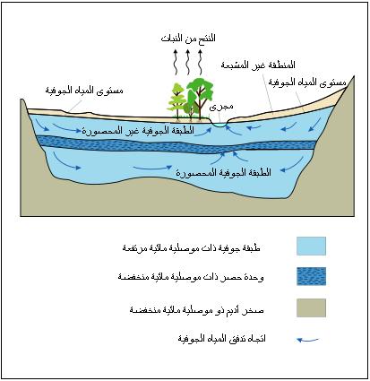 المياه الجوفية: تشمل الماء المخزون في القشرة الأرضية الذي يخرج إلى السطح أحياناً على شكل عيون وينابيع، أو يستخرجه الانسان بالآبار، وعلى الرغم من كون الأمطار هي المصدر الرئيس للمياه الجوفية، إلا أن تلك المياه تحظى في المناطق الجافة وشبه الجافة بأهمية قصوى نظراً لتوزيعها الجغرافي حيث تتوفر أحياناً بكيمات كبيرة في مناطق ذات أمطار هي شحيحة. و توجد ضمن القشرة الأرضية في خزانات خاصة تعرف بخزانات المياه الجوفية وهي طبقات من صخور رسوبية ذات مسامية مرتفعة تتجمع فيها المياه.