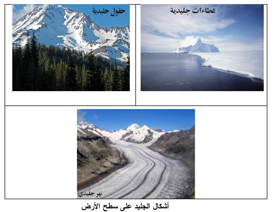 كتل الجليد التي تغطي قمم الجبال العالية مثل جبال الألب في أوروبا وجبال هيمالايا.