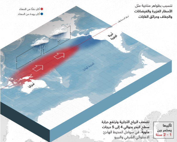 ظاهرة التذبذب الجنوبي: (ENSO) : هي دورة مناخية تحدث بسبب النمط المتغيّر لدرجة حرارة المياه في المحيط الهادئ، وتُعرف مرحلة الزيادة في درجة حرارة البحر بالنينو (El Niño)، بينما تُعرف مرحلة التبريد بالنينا (La Niña)، ويكون تأثير هذه الأنماط على درجة الحرارة العالمية لفترة قصيرة من الوقت، أي لأشهر أو سنوات، ولا تفسّر الاحترار المستمرّ الذي يحدث اليوم.