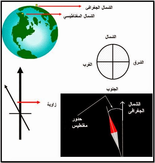 الشمال الحقيقي أو الجغرافي: وهذا الاتجاه يشير إلى القطب الشمالي ويتفق مع اتجاه خطوط الطول ، وهذا الاتجاه ثابت لا يتغير لذلك اطلق عليه اسم الشمال الحقيقي.