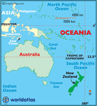 نيوزيلاندا: تقع جنوب غرب المحيط الهادئ، ويصل عدد سكانها إلى خمسة ملايين نسمة, وهذه الدولة تعيش في عزلة جغرافية, فهي واقعة إلى الجنوب الشرقي من أستراليا على بعد ألفي كيلومتر، عبر البحر التاسماني، والدول الأقرب إليها كاليدونيا وفيجي تونغا, يكون المناخ معتدل صيفا وبارد شتاءا، وتسقط الأمطار على مدار العام .