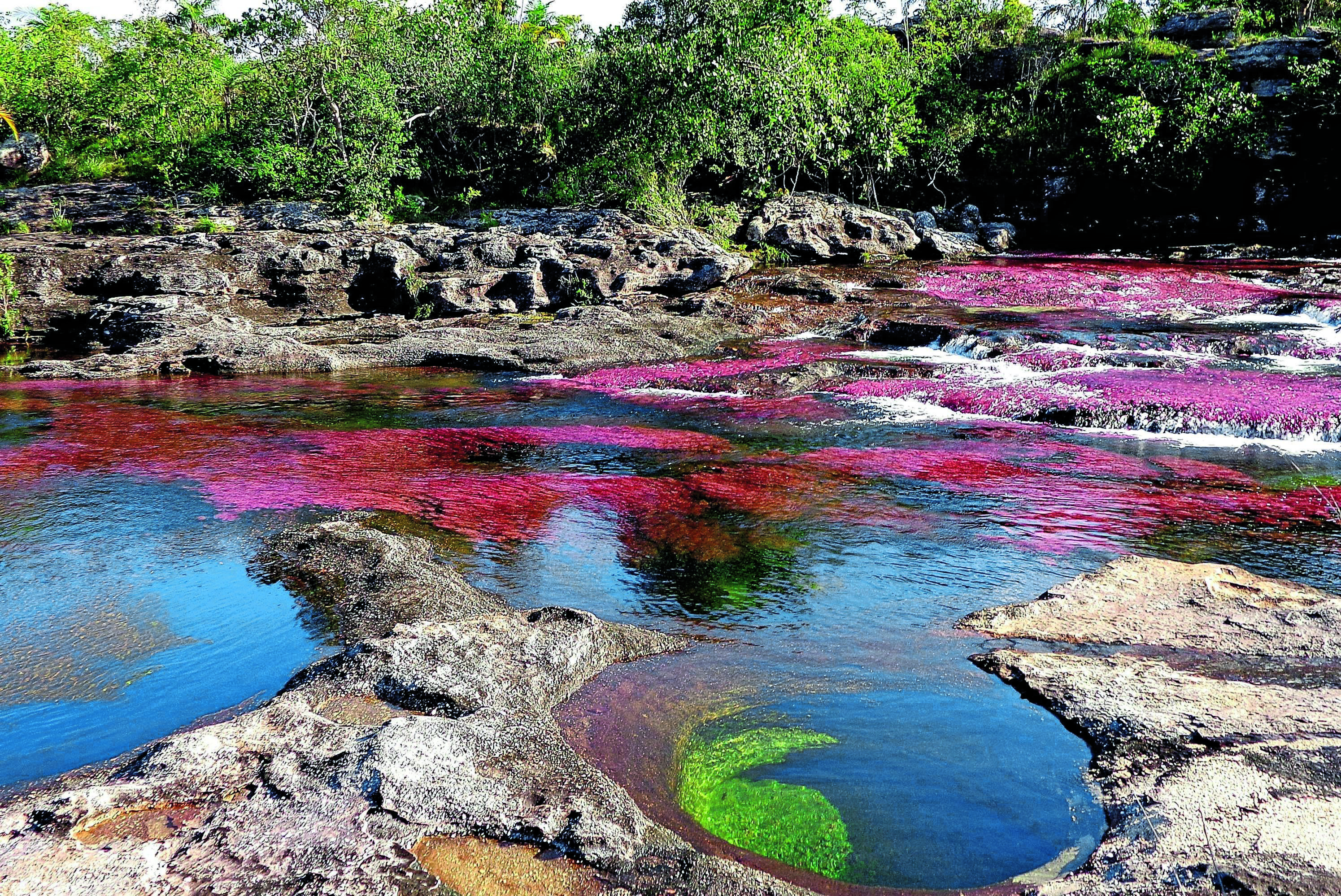 يشتهر نهر كانيو كريستالز، في كولومبيا، بألوانه العديدة الرائعة التي تتغير بين الأصفر والأخضر والأزرق والأسود ، وخاصة الأحمر، وذلك بسبب نباتات مائية تدعى " ماكارينيا كلافغيرا" على مجرى النهر "macarenia clavigera"