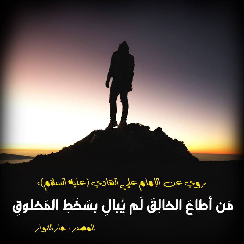 الإمام علي بن محمد الهادي ( عليه السلام ) أنهُ قَالَ : مَن أطاعَ الخالِقَ لَم يُبالِ بسَخَطِ المَخلوقِ .