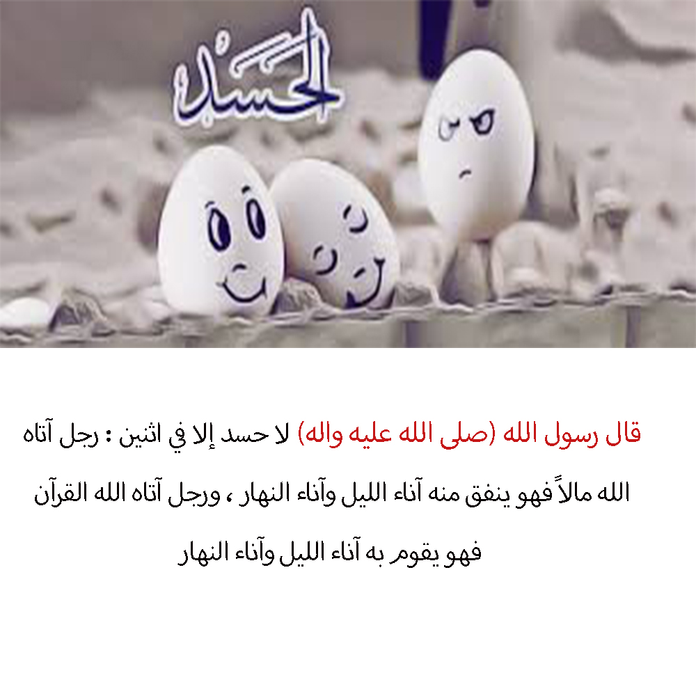 قال رسول الله (صلى الله عليه واله) لا حسد إلا في اثنين : رجل آتاه الله مالاً فهو ينفق منه آناء الليل وآناء النهار ، ورجل آتاه الله القرآن فهو يقوم به آناء الليل وآناء النهار.