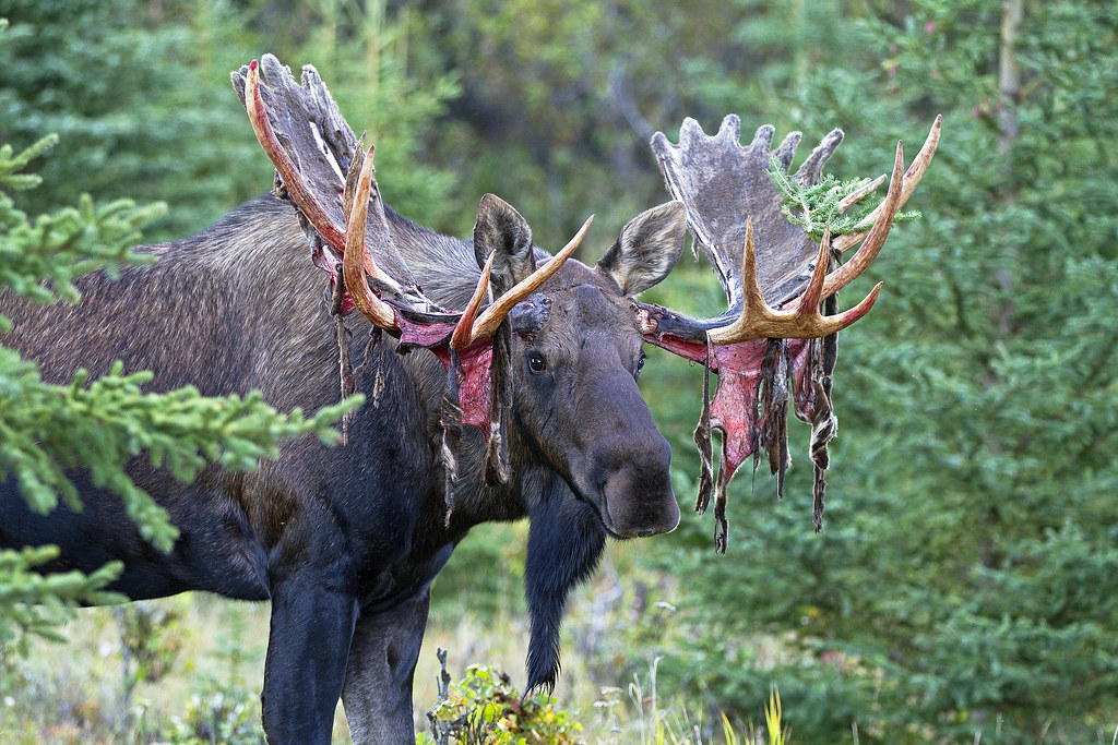 While the antlers are growing they are covered with densely vascularized tissue known as velvet which dries once the antler growth is complete by the late summer. The dry velvet is removed by rubbing against trees and other solid objects leaving only the bare antler bone exposed. Male moose also have a large dewlap hanging under their neck sometimes called a bell.