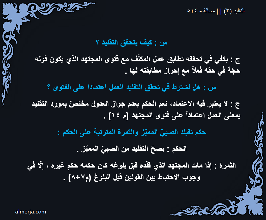 س : هل نشترط في تحقق التقليد العمل اعتمادا على الفتوى ؟