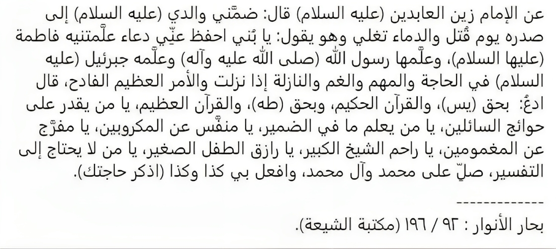 "اللّهُمَّ عَرِّفْنِي نَفْسَكَ فَإِنَّكَ إِنْ لَمْ تُعَرِّفْنِي نَفْسَكَ لَمْ أَعْرِفْ رَسُولَكَ، اللّهُمَّ عَرِّفْنِي رَسُولَكَ فَإِنَّكَ إِنْ لَمْ تُعَرِّفْنِي رَسُولَكَ لَمْ أَعْرِفْ حُجَّتَكَ، اللّهُمَّ عَرِّفْنِي حُجَّتَكَ فَإِنَّكَ إِنْ لَمْ تُعَرِّفْنِي حُجَّتَكَ ضَلَلْتُ عَنْ دِينِي".