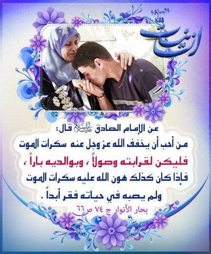 روي داود بن كثير الرقي عن الإمام الصادق عليه السلام حيث قال: (سمعت أبا عبد الله الصادق عليه السلام يقول: من أحب أن يخفف الله عز وجل عنه سكرات الموت ، فليكم لقرابته وصولاً ، وبوالديه باراً ، فإذا كان كذلك ، هوّن الله عليه سكرات الموت ، ولم يصبه في حياته فقر أبداً). أمالي الصدوق ص473.