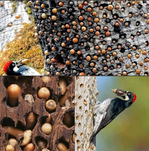 نقار الخشب يجمع جوز البلوط ويضعها في ثقوب جذوع الأشجار