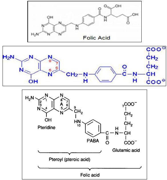 مجموعة مركبات حامض الفوليك Folic Acid والتي يطلق عليها أيضاً Folates وتتكون من حوالي عشرة مركبات تحوي على الكاربون، هيدروجين، نتروجين وأوكسجين بالصيغ C49H61N13O24 – C15H12N6O4 والتركيب العام لها في الشكل الآتي :