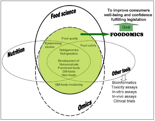 دراسة الاغذية وتاثيرها وذلك بتطبيق وادماج دراسات –omics الحديثة لغرض تحسين صحة الافراد ، ويعد المجال من المجالات المهمة لتحسين نوعية الاغذية ، ويكون ذلك باجراء الدراسات حول استهلاك وانتاج الاغذية كسلسلة كاملة . ويعد المجال واسعا ويستغل الطرق السريعة High- throughput وتقنيات (MS (Mass Spectroscopy ، ويدخل في المجال الدراسات الجينومية ودراسة النسخ Transcriptomics ودراسة مكنون البروتينات ومكنون الايض للاغذية ، وتطوير اغذية معدلة وراثيا لتحديد النسق الجزيئي Molecular Profile ، وكذلك استعمال المعلوماتية الحيوية ووسائلها المختلفة ، فضلا عن دراسة تداخل المكنون الميكروبي خاصة في الجهاز الهضمي Gut Human Microbiome والمجال غير من بحوث التغذية التقليدية الى افاق جديدة ، وكل هذه يجب ان تكون خاضعة لدرجات ومؤشرات للتقييم ، والتداخل بين هذه العلوم موضح في الشكل الاتي :