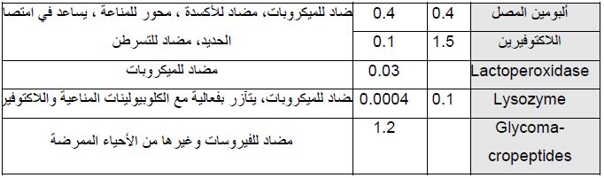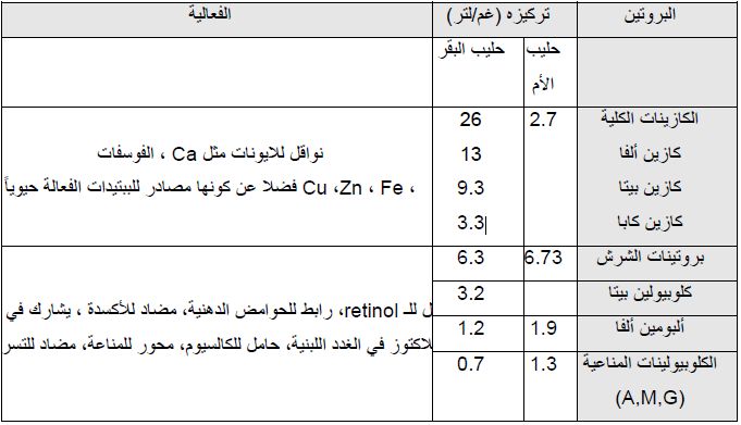 بروتينات الحليب التي تظهر فعاليات فسلجية او دوائية فضلاً عن فوائدها التغذوية والجدول التالي يوضح بعض هذه البروتينات وفعالياتها وتراكيزها في الحليب ألبقري والبشري .