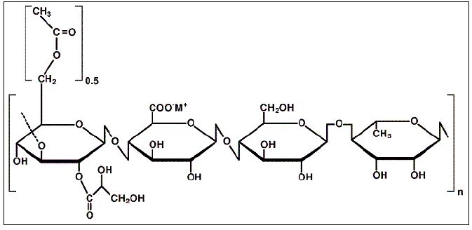 سكريات مكوثرة مستقيمة السلسلة غير متجانسة الوحدات سالبة الشحنة Anionic ، ينتج من بكتريا Pseudomonas elodea (التسمية الحالية Sphingomonas paucimobilis ) او S. elodea وقد سمح باستعماله في الاغذية أواخر السبعينات من القرن العشرين .والتركيب الكيماوي للمكوثر موضح في الشكل الآتي :