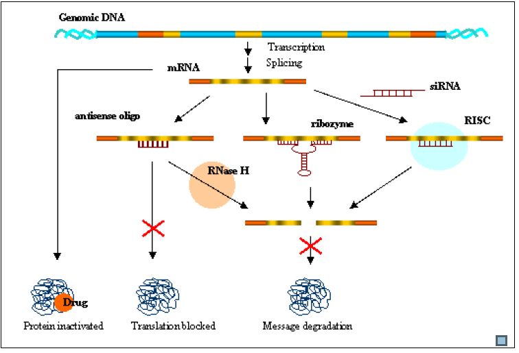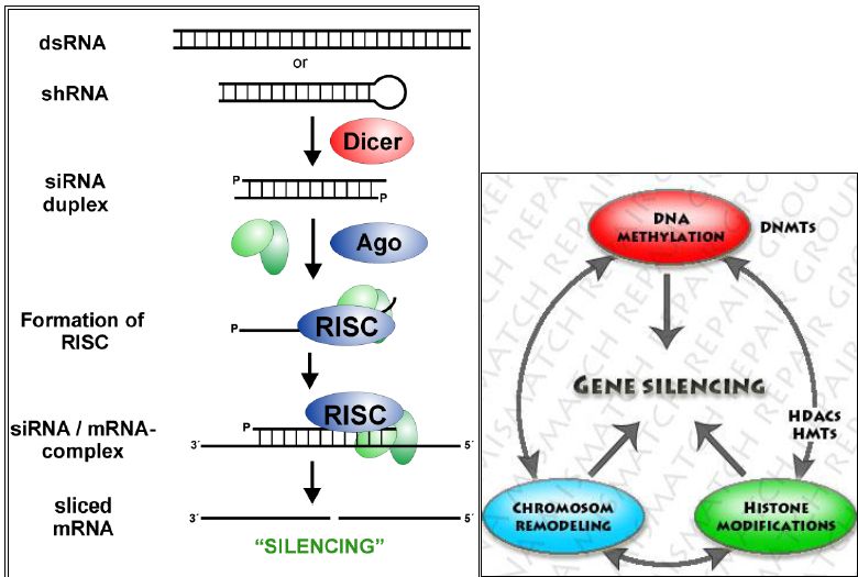 والاليات هي المثيلة مثل مثيلة ممهد الجين الذي يؤدي في الغالب الى ايقاف التعبير عن الجين أي اسكاته ومن المعروف ان تنظيم الجينات يتم بشكل أساس على مستوى الانتساخ Transcription او الترجمة Translation والمراحل التي تسبق او تلي اي من العمليتين. ففي الحالة الأولى يمكن للكروماتين المتباين ان يحور ويلتف حول DNA مكوناً بيئة لا تسمح لماكنة الانتساخ مثل إنزيم كوثرة RNA Polymerase والعوامل المرافقة له كعوامل الانتساخ وغيرها من الوصول الى الجين وإجراء عملية انتساخه ، في حين ان التحويرات الممكنة بعد عملية الانتساخ يمكن ان تجري على RNA الناتج من نسخ DNA للجين. وكل من العمليتين سواء السابقة للانتساخ او التي تعقبه تستعمل لتنظيم الجينات الداخلية للكائن وهي تقوم بحماية الجينوم من الجينات القافزة والفيروسات وتمثل إحدى طرق المناعة القديمة للمحافظة على جينومات الأحياء من الأحياء الغازية الأخرى . ويمكن ان تتم على مستوى RNA ويمكن ان تكون باستعمال Antisense RNA . وبذلك يمكن للخلايا ان تغلق قطع كبيرة من DNA . وقد تستغل هذه في معالجة السرطانات وغيرها من الامراض وتشكل استراتجية مهمة في تصميم الادوية ، فضلا عن استعمالها في تحوير النباتات .