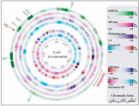 يوضح الشكل التالي الأطلس الخاص بكروماتين البكتريا E. coli والسلالة المستعملة في الشكل أعلاه