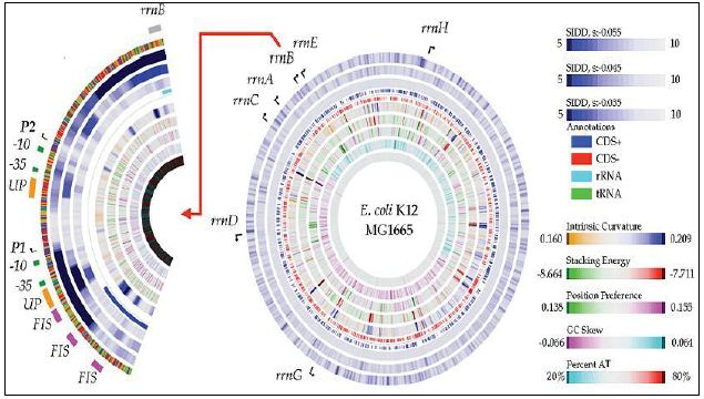 أطالس تهتم بتوضيح الممهدات وعناصر التنظيم ، لذلك فهي تساعد في التنبؤ بالممهدات وعناصر التنظيم وتستعمل قاعدة بيانات خاصة لهذه الصفة. والشكل التالي يوضح أطلس الزعزعة SIDD لإحدى سلالات E. coli ، وتكون مثل هذه الأطالس قابلة للتكبير كما موضح في الشكل وتحسب فيها قيم SIDD استنادا" الى قواعد البيانات المستعملة ، ويظهر الشكل الصفات التركيبية ومواقع اوبرونات rrn