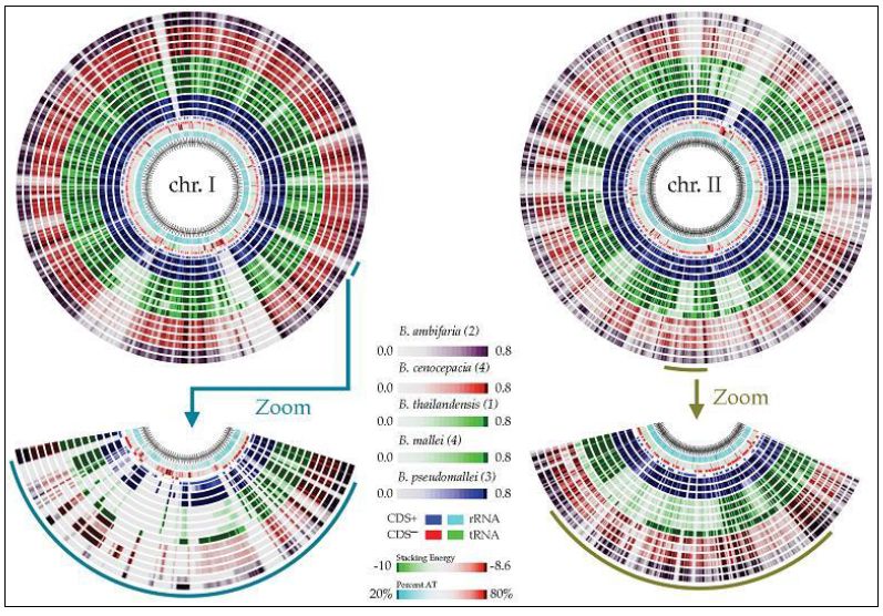 أطالس تهدف الى إجراء المقارنات بين السلالات المختلفة ، او مقارنة جينومات أحياء مختلفة . والغرض من وضع هذه الأطالس هو إجراء المقارنة لأغراض معينة مثل مقارنة جزر الامراضية بين السلالات البيئية والسلالات المرضية التي تعود الى النوع نفسه من البكتريا وكذلك التعرف على مناطق إقحام العاثيات او فقدان بعض المواد الوراثية المهمة ، ومواقع العنقدة وغيرها . ومثل هذه الأطالس تكون مهمة لمقارنة العديد من سلالات النوع الواحد التي تم تحديد توالياتها ومنها الموضح في الشكل التالي لمقارنة أنواع مختلفة من جنس البكتريا Burkholderia .