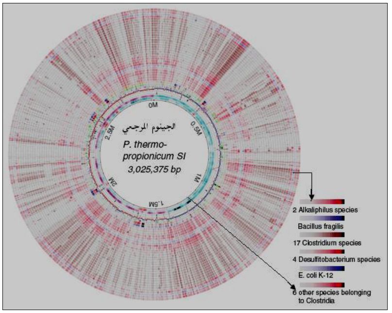 ونظرا" لكثرة الجينومات المستعملة فضلا" عن قلة التطابقات ( BLAST Hits) الموجودة في النماذج البيئية يلاحظ ان الألوان تكون باهتة . ويظهر الشكل مقارنة 31 نوع من أجناس بكتيرية مختلفة .