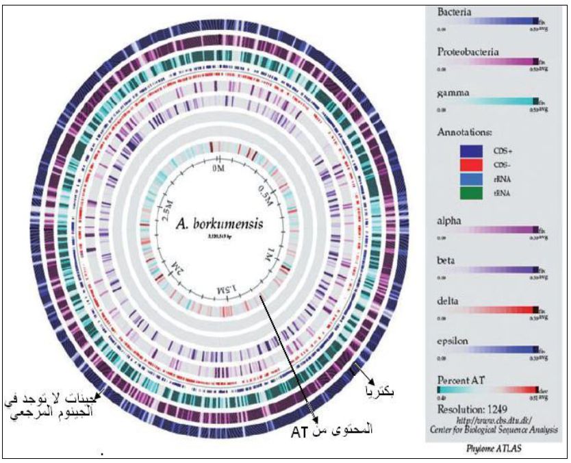 ويوضح الشكل وفق تدرج البيانات (الأيمن ) البكتريا عامة وأقسامها اما الدائرة الداخلية فتوضح المحتوى لل AT ،اما الخطوط الباهتة فتشير الى عدم وجود جينات ليس لها متشابهات في الجينوم المرجعي .