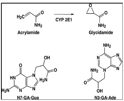 يؤدي الى احداث تدمير في DNA ، ويكون ذو قابلية تطفيرية اكثر من الاكريلاميد ، اذ يحدث طفرات من نوع Transversion مثل G→T