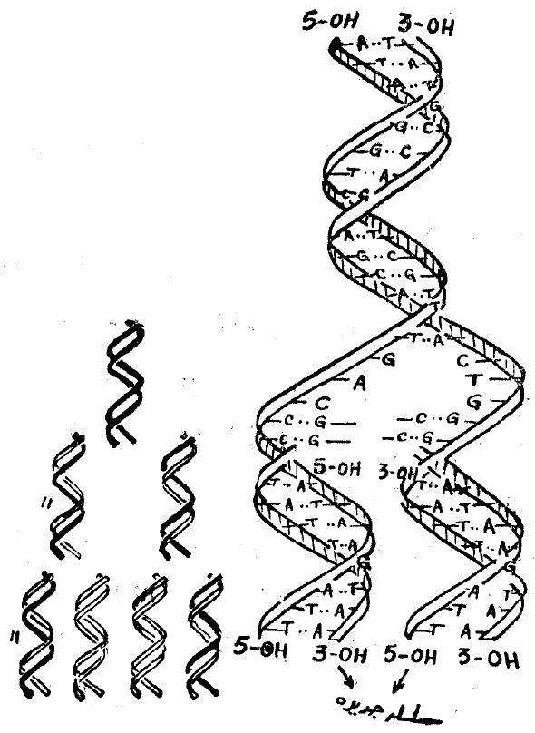 بالنسبة للـ DNA الكروموسومي ( والفيروسي ) فان تتابع القواعد الأربعة على أحد الخيطين يحدد القواعد الموجودة على الخيط الآخر كما سبق شرحه. خلال نسخ جزيئات DNA جديدة فان كل جزيء أدنين يرتبط بجزيء شقيق هو الثايمين ، وكل جزيء جوانین يرتبط بجزيء شقيق هو السيتوزين. نبدأ هذه العملية بأن يحل الالتواء عند إحدى نهايتي السلم ( الحلزوني المزدوج ) وتنفصل القواعد كل عن شقيقتها ، ونظرا لأن السائل الخلوي في الخلية يحتوي على عديد من القواعد الحرة سابحه فيه، فإنه عند اقتراب قاعدة مرتبطة بأحد قائمي السلم من قاعدة شقيقه حره فأنها ترتبط بها مكونان معا درجة كاملة من جديد، وعلى هذا فبينما ينفك الالتواء فان قواعد جديدة يتصل بها السكر والفوسفات تنضم لتكمل الدرجات، في حين يكون السكر والفوسفات قائمي لسلم، وعندما يتم فك الالتواء يكون قد تكون سلمان جديدان (الشكل التالي).