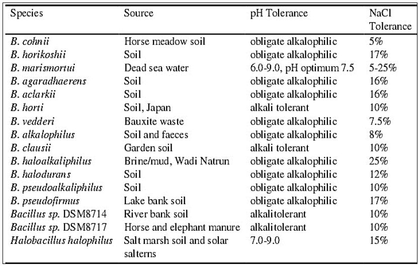 احياء تعيش في بيئات قلوية مرتفعة الرقم الهيدروجيني أعلى من 7 - 10 فضلا عن حاجتها الى تراكيز عالية من كلوريد الصوديوم تصل الى 35 % وهي توجد في البحيرات القلوية Soda Lakes مثل بحيرة Magadi في كينيا وبحيرة وادي النطرون في مصر ، وتضم الاحياء المحبة للقلوية ، مجاميع فسلجية مختلفة ، واغلبها تعود الى العائلة Halobacteriaceae ، ولكن توجد افراد من جنس Bacillus لها هذه الصفات والموضح بعضها في الجدول الاتي :