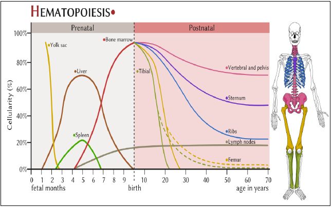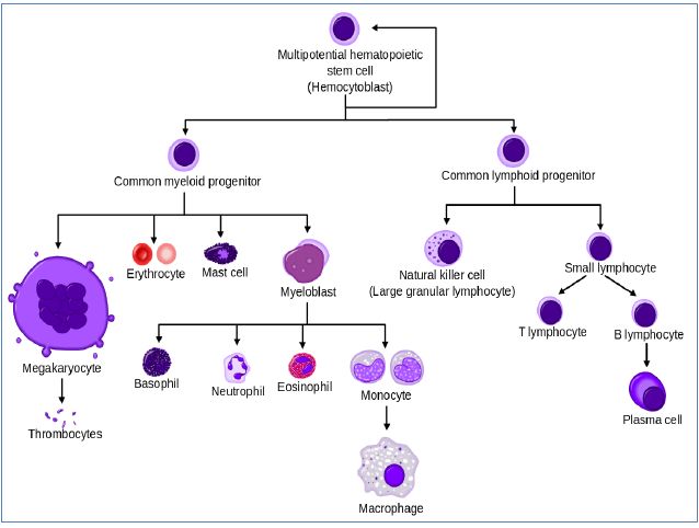 عملية تكوين الدم وخلاياه في الكائنات الحية وتسمى Hemopoiesis ، وتحدث داخل نخاع العظام او في اعضاء اخرى مثل الطحال او العقد اللمفاوية ، وفي حالة فقر الدم يمكن ان تتكون في Extramedullary Hematopoiesis . وتشمل العملية تكوين الخلايا وتطورها ونضوجها بعد اشتقاقها من Stem Cells وخاصة Pluripotent القادرة على اعطاء جميع انواع الخلايا وتختلف مواقع نشؤها في الاجنة عنه في البالغين :
