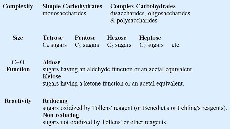 Carbohydrates are called saccharides or, if they are relatively small, sugars. Several classifications of carbohydrates have proven useful, and are outlined in the following table.