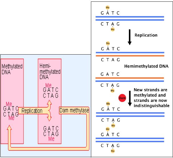 اشرطة DNA بعد التضاعف مباشرة ، اذ تكون الاشرط القديمة حاوية على المثيل ام الجديدة فتنتظر اضافة مجاميع المثيل اليها وهناك بعض انزيمات المثيلة Methylases التي تكون لها الفة عالية جدا لاضافة المثيل . كما موضح في الاتي :