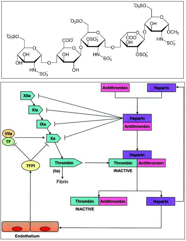 معقد من حامض عضوي من السكريات المكوثرة الحاوية على الكبريتات Sulfated Glycosaminoglycan مضاد للتجلط طبيعي ينتج من الخلايا القاعدية Basophils والخلايا الصارية . يوجد في انسجة مختلفة وخاصة الكبد . يمنع تكون الجلطات ولكنه لا يفكك المتكونة منها ولا يشبه Plasminogen Activator . يستعمل في معالجة العديد من الحالات ، اذ عند حقنه في الجسم يمنع التخثر ولذا يستعمل في علاج التخثر Thrombosis . له صفات Lipotropic ونقل الدهون من الدم الى ترسبات الدهون وينشط Lipoprotein Lipase وينشط العوامل XIIA,XIA,XA, 1XA وغيرها ، وله مشتقات واطئة الوزن الجزيئي مثل (Tinzaparin (Innohep) , Dalteparin (Fragmin) , Enoxaparin (Lovenox التي تستعمل في حالات خاصة . الانتاج التجاري له يتم باستخلاصه من كبد ورئات للحيوانات الداجنة . تركيبه موضح في الاتي :